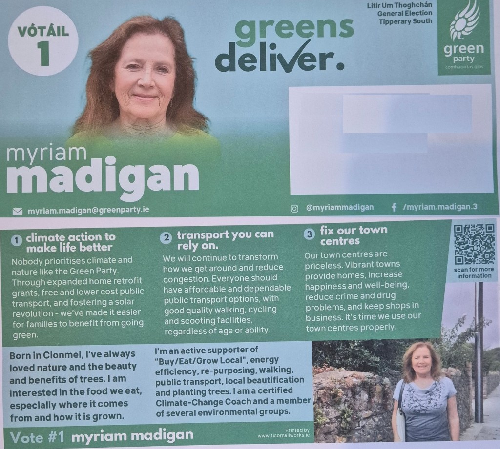 A Leaflet from Myriam Madigan who is running for The Green Party in Tipperary South in the 2024 General Election