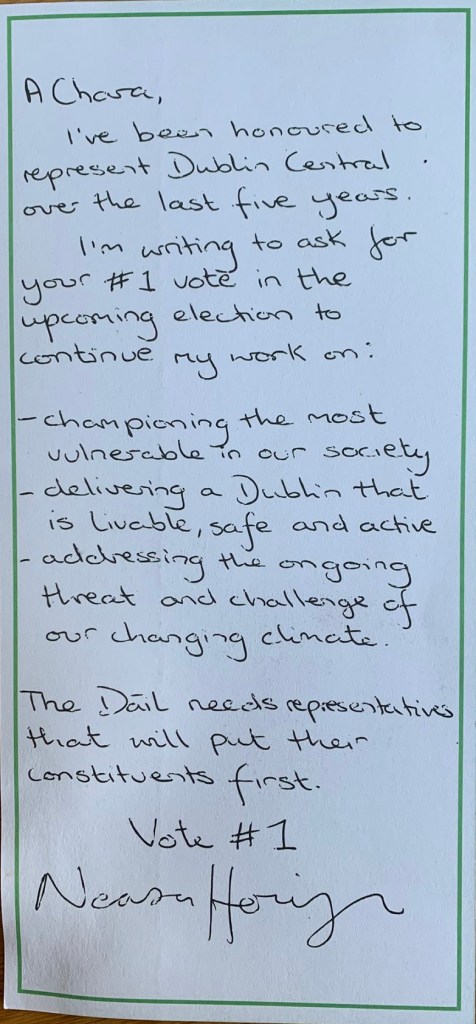 A quite different litir um thoghcháin with a handwritten note on the reverse from Neasa Hourigan of the Green Party running in Dublin Central in the 2024 General Election