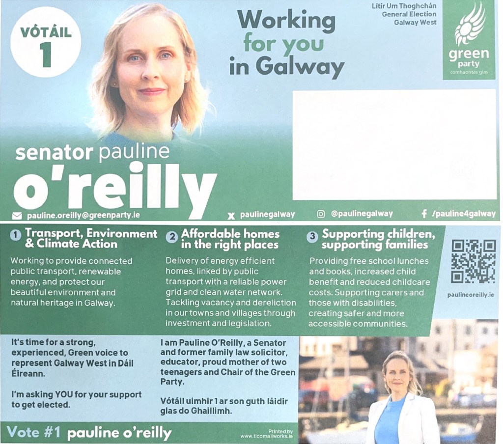 A leaflet from Pauline O’Reilly who is running for The Green Party in Galway West in the 2024 General Election