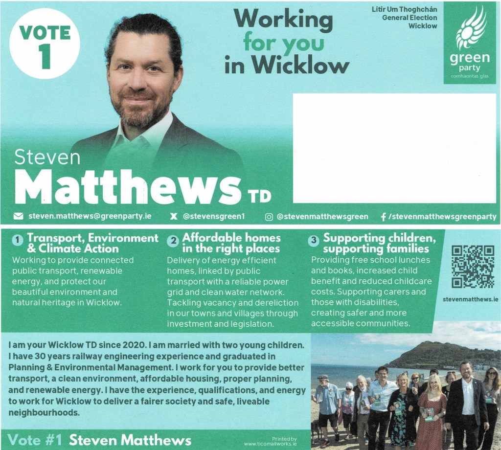 A Leaflet from Steven Matthews who is running for The Green Party in Wicklow in the 2024 General Election
