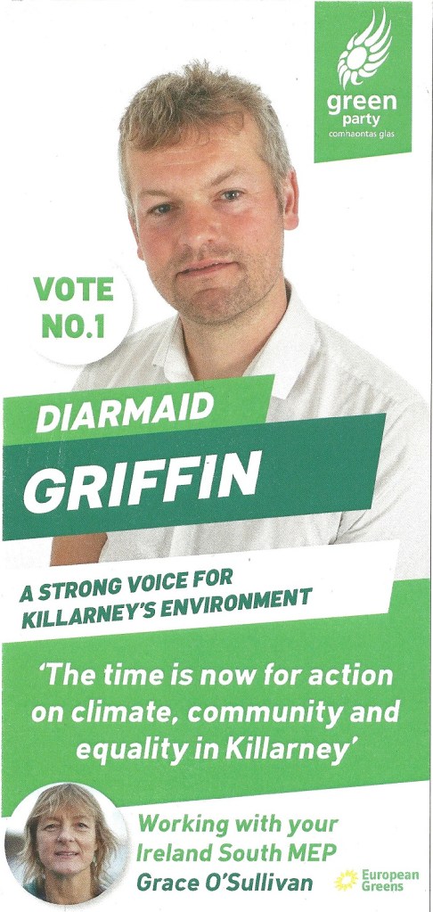 A leaflet from Diarmaid Griffin who is running for The Green Party in Killarney in the 2024 Local Elections.
