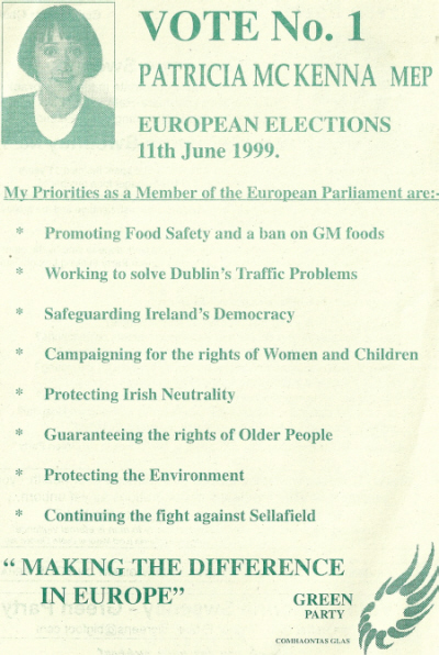 From the 1999 European Elections, a leaflet produced by Green Party Candidate Patricia McKenna asking ‘Is GM Food Safe?’. Many of the concerns are still shared today.