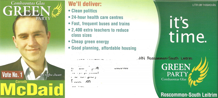 From the 2007 General Election a leaflet from Garreth McDaid running for the Green Party in Roscommon South Leitrim.