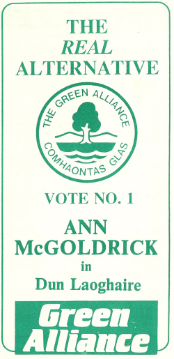 From the 1987 General Election, Green Party candidate Ann McGoldrick running in Dun Laoghaire. She polled 929 votes.