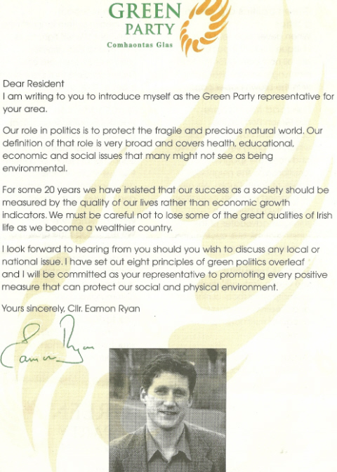 A 2001 leaflet where the then Green Party Councillor Eamon Ryan introduces himself to the voters of Dublin South June 16, 2010