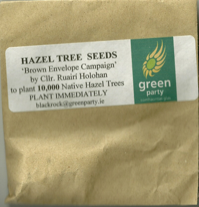 From the 2009 Local Elections in Blackrock, a packet of Hazel Tree seeds from Green Party candidate Ruairi Holohan. The seeds were given out as part of the ‘Brown Envelope Campaign’.