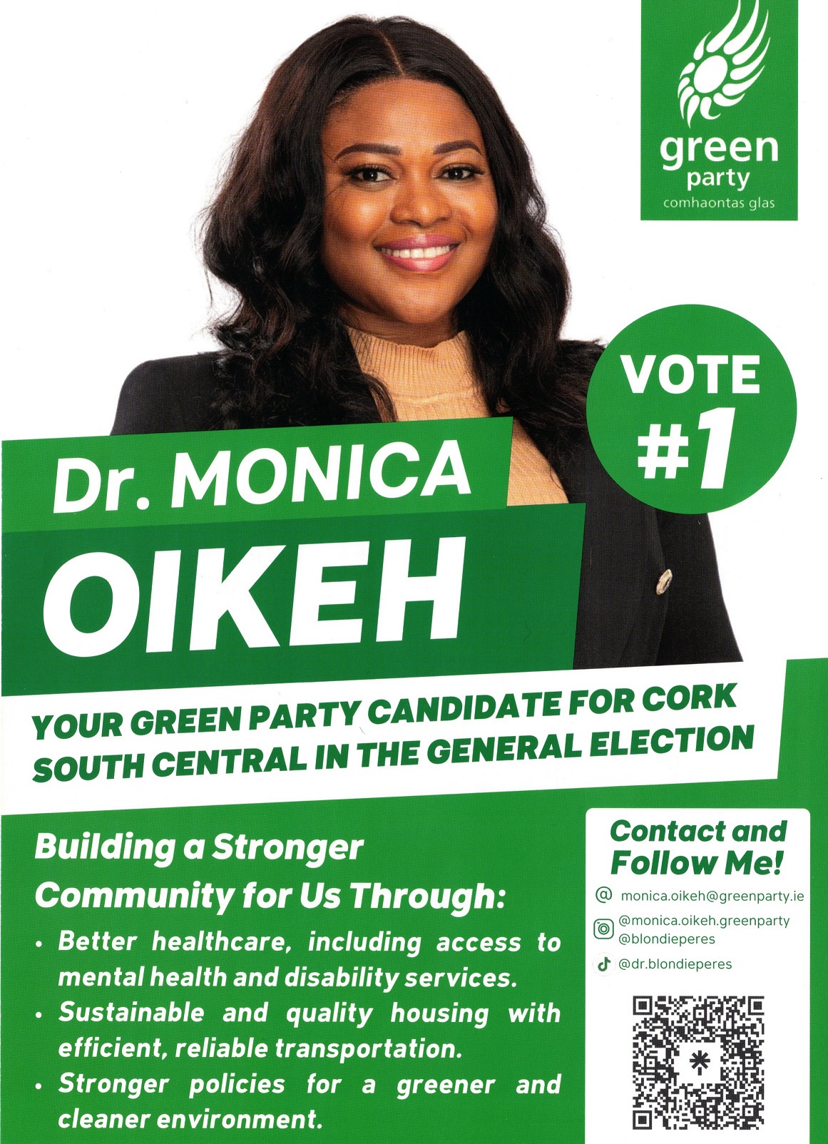 A Leaflet from Dr. Monica Oikeh who is running for The Green Party in Cork South Central in the 2024 General Election