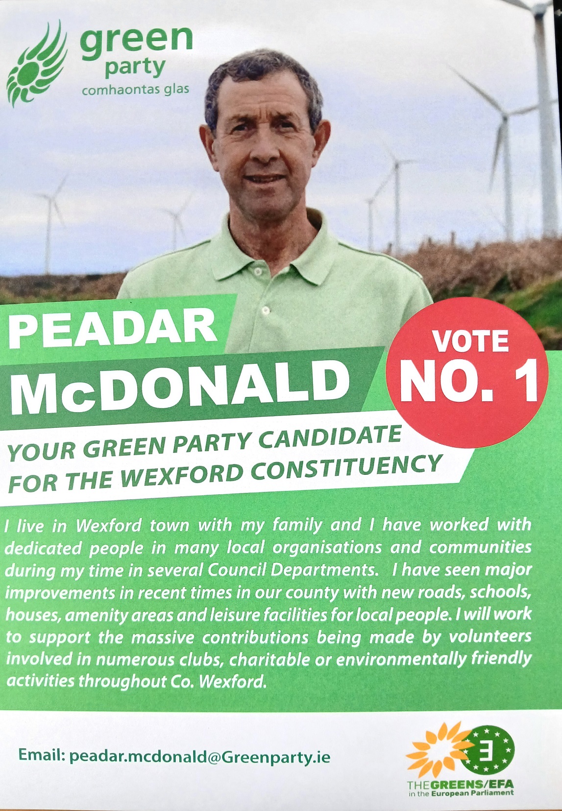 A Leaflet from Peadar McDonald running for The Green Party in Wexford in the 2024 General Election