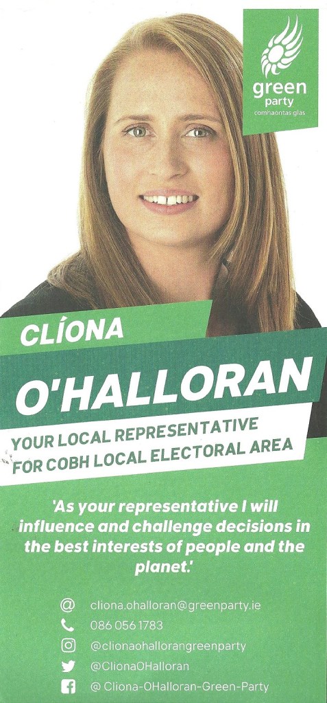 A leaflet from Clíona O’Halloran who is running for The Green Party in Cobh in the 2024 Local Elections.