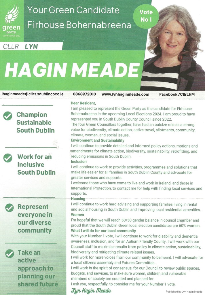 A leaflet from Lyn Hagin Meade who is running for The Green Party in Firhouse Bohernabreena in the 2024 Local Elections.