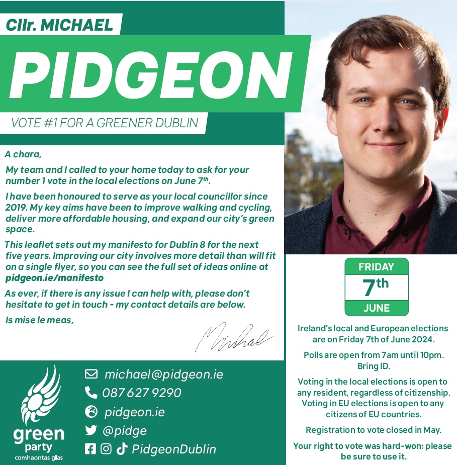A leaflet from Michael Pidgeon who is running for The Green Party in Dublin’s South West Inner City in the 2024 Local Elections. He commissioned an Irish artist to do an illustration of Kilmainham Lane which is on the back of the leaflet.