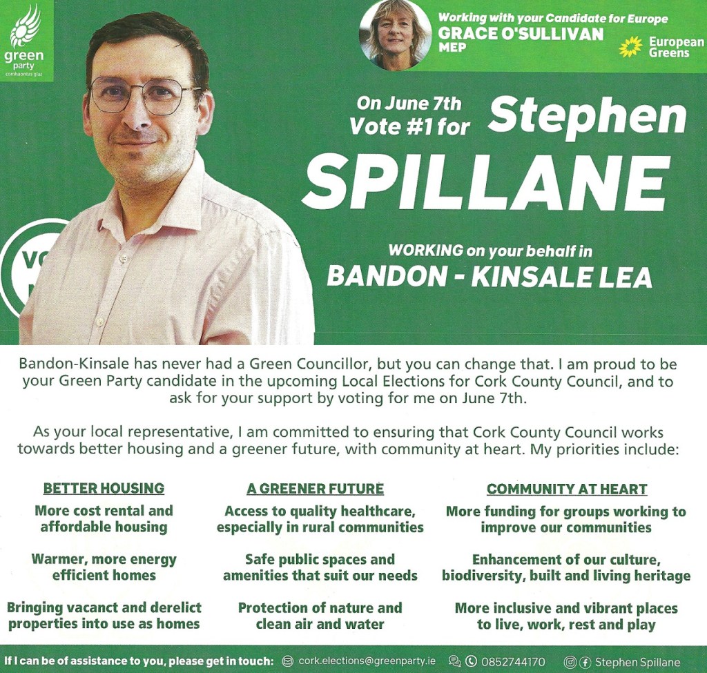 A leaflet from Stephen Spillane who is running for The Green Party in Bandon Kinsale in the 2024 Local Elections