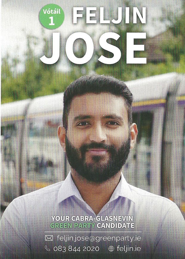 A leaflet from Feljin Jose who is running for The Green Party in Cabra Glasnevin in the 2024 Local Elections