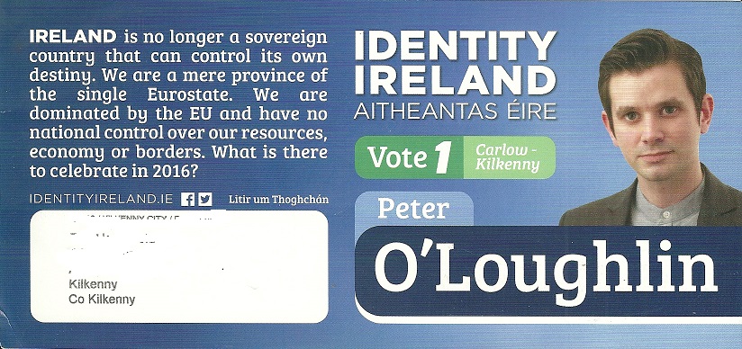A Leaflet from Peter O’Loughlin who ran for Identity Ireland in the 2015 Carlow Kilkenny Bye Election. He polled 930 votes.