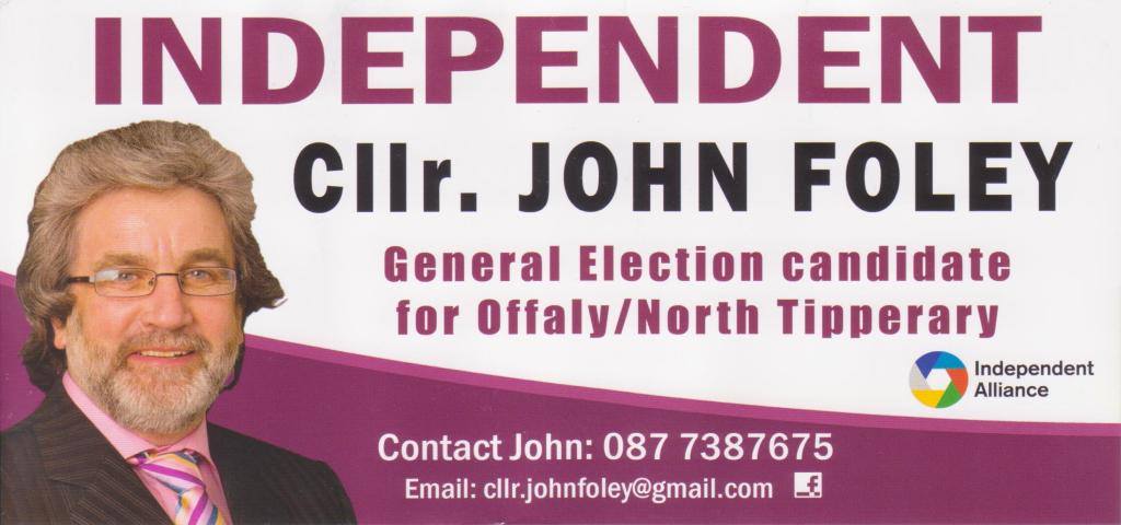 A leaflet from Cllr John Foley who is running as an Independent Alliance candidate in Offaly /North Tipperary. He was previously a Fianna Fail Cllr and General Election candidate.