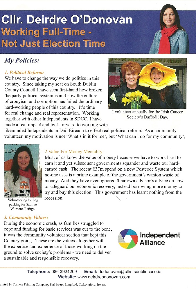 Leaflet from Deirdre O’Donovan- Independent Alliance -Dublin South West #ge16 February 12, 2016