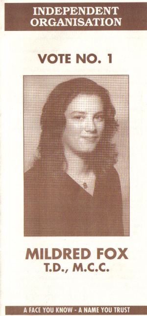 Mildred Fox an Independent TD for Wicklow, was first elected in 1995 in a By Election caused by the death of her father Johnny Fox. Johnny Fox was a Fianna Fail Councillor who ran as an Independent candidate in the 1992 General Election , having failed to get a nomination from Fianna Fail.
