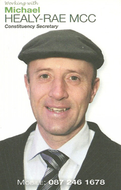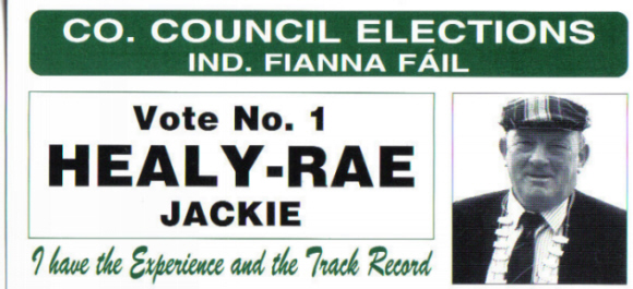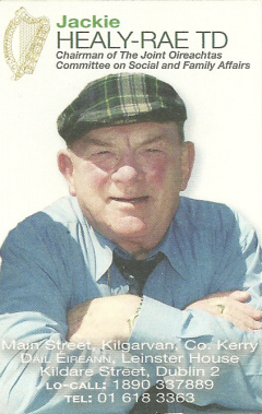 Jackie Healy-Raes card, himself on the front and his constituency secretary Michael Healy-Rae on the back. Jackie Healy-Rae doesn’t advertise his mobile number.