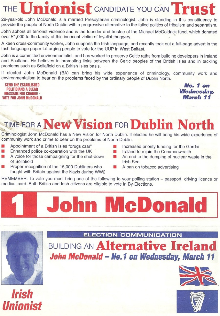 From the 1998 Dublin North By-Election a leaflet from Irish Unionist candidate John McDonald. He polled 107 votes .