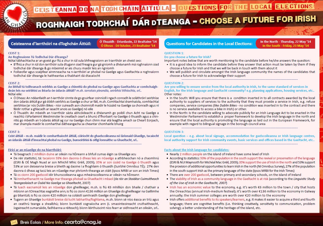 A leaflet issued by Conradh na Gaeilge with suggested questions for all local government and European Election candidates for the 2014 European and Local Elections.