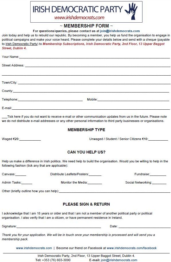A membership form for the newly founded ‘Irish Democratic Party’ September 21, 2010