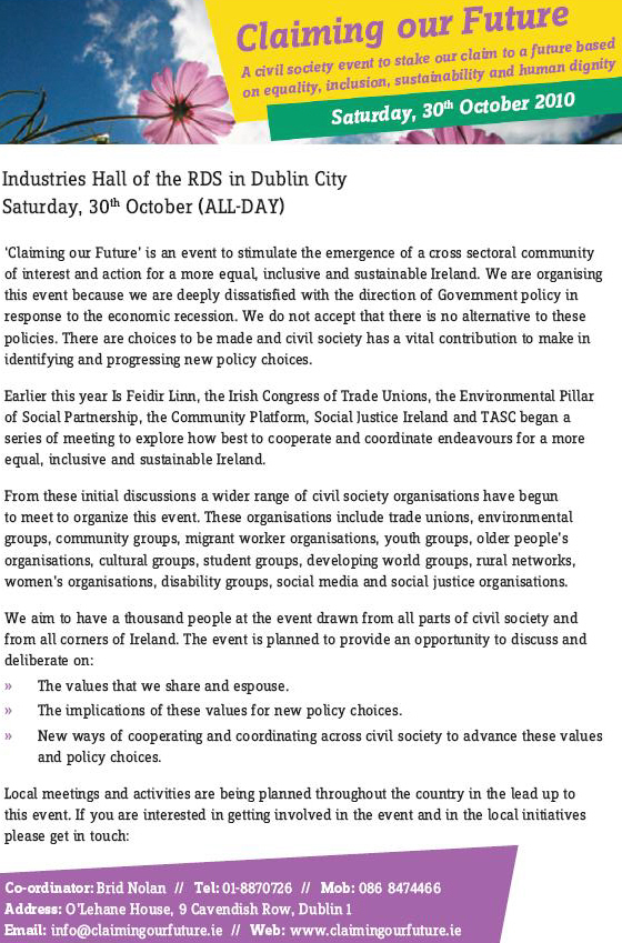 Flyer for “Claiming Our Future” -30th October 2010 RDS October 15, 2010