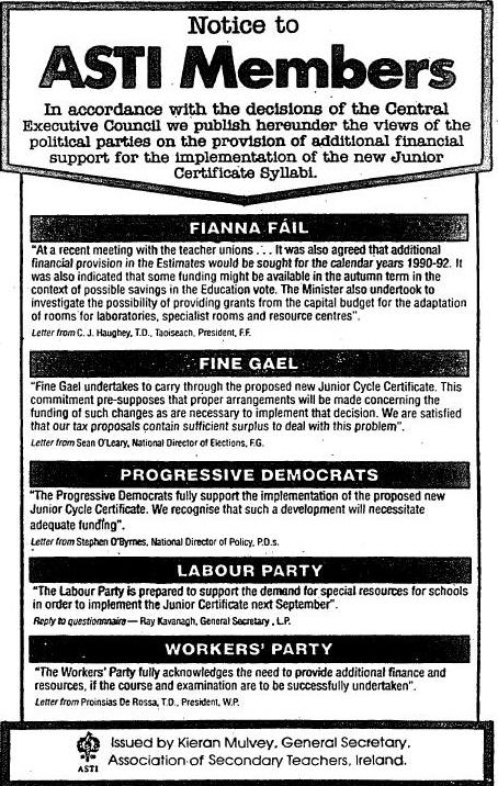 From the 1989 General Election a “Notice to ASTI Members” regarding the various Political Parties positions on the funding for the new Junior Certificate.