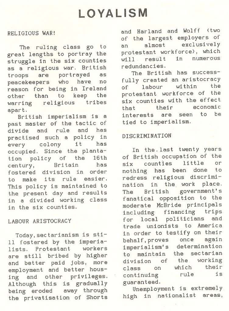 From the late 1980’s one of a series of Information Sheets issued by the IRSP. This one is on “Loyalism”
