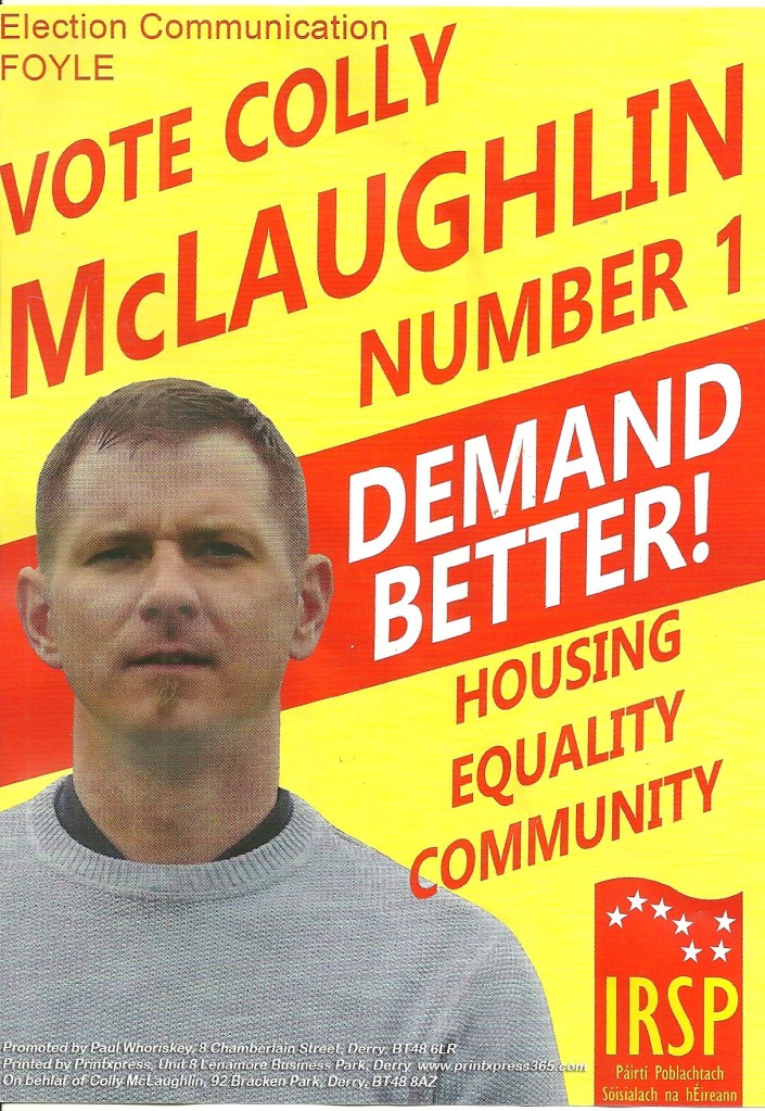 From the 2022 Assembly Elections , a leaflet from Colly McLaughlin who was running for The IRSP in Foyle. He polled 766 votes and missed out on a seat.