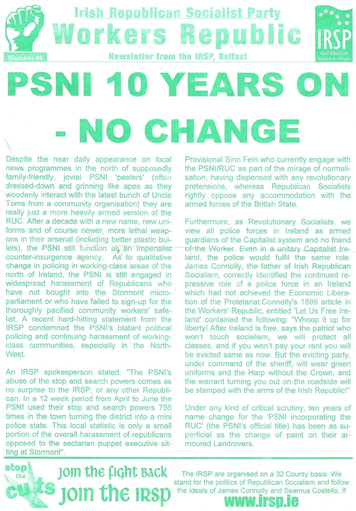 From November 2011 an edition of “Workers Republic”, the newsletter of the Belfast IRSP.
