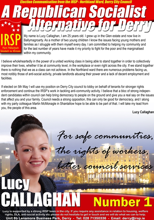From the 2011 Local Elections a leaflet from Lucy Callaghan of the IRSP running in Northland Ward for a seat on Derry City Council. It’s the first time in many years that the IRSP have contested an election in Northern Ireland.