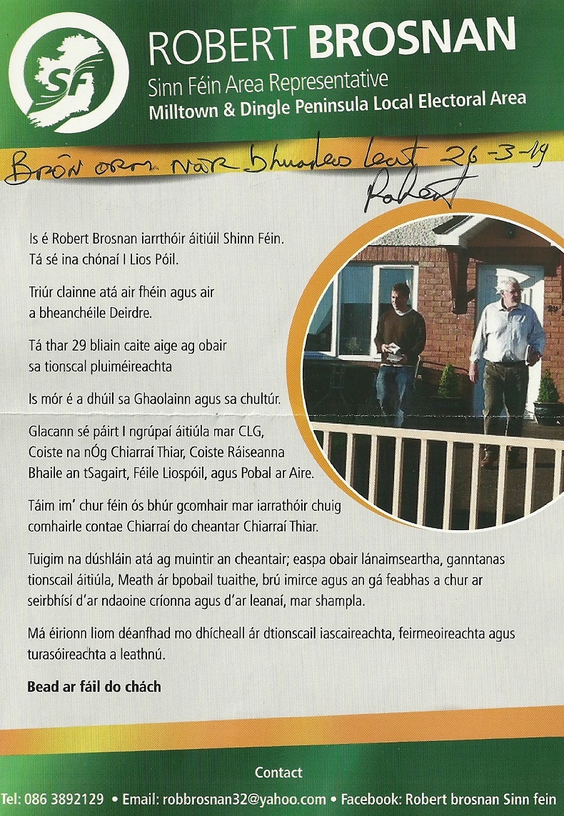 A bilingual leaflet (with a “sorry I missed” you as Bearla agus as Gaelige) le Robert Brosnan runing for Sinn Féin in An Daingean.