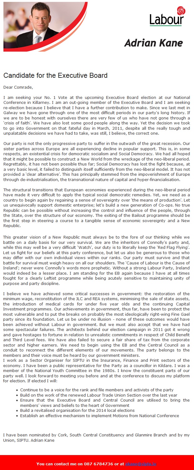 From the 2013 Labour Party conference. A communication from Adrian Kane who is running for the Executive Board.