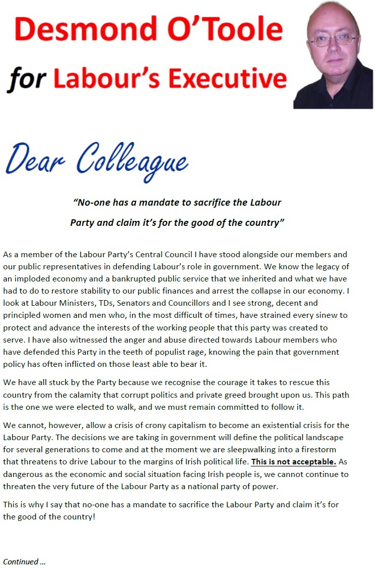 From the 2013 Labour Party Conference in Killarney a leaflet from Loraine Mulligan who is running for the position of Labour Party Chairperson.