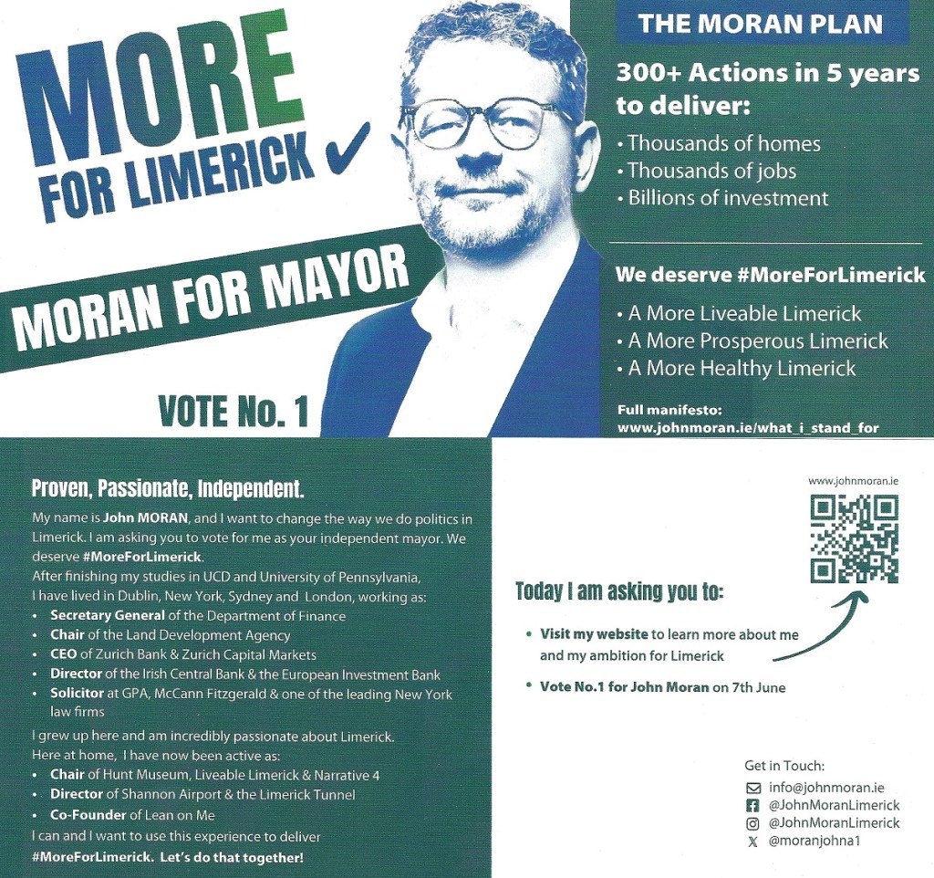 A leaflet from John Moran who is an Independent candidate in the 2024 Limerick Mayoral Election