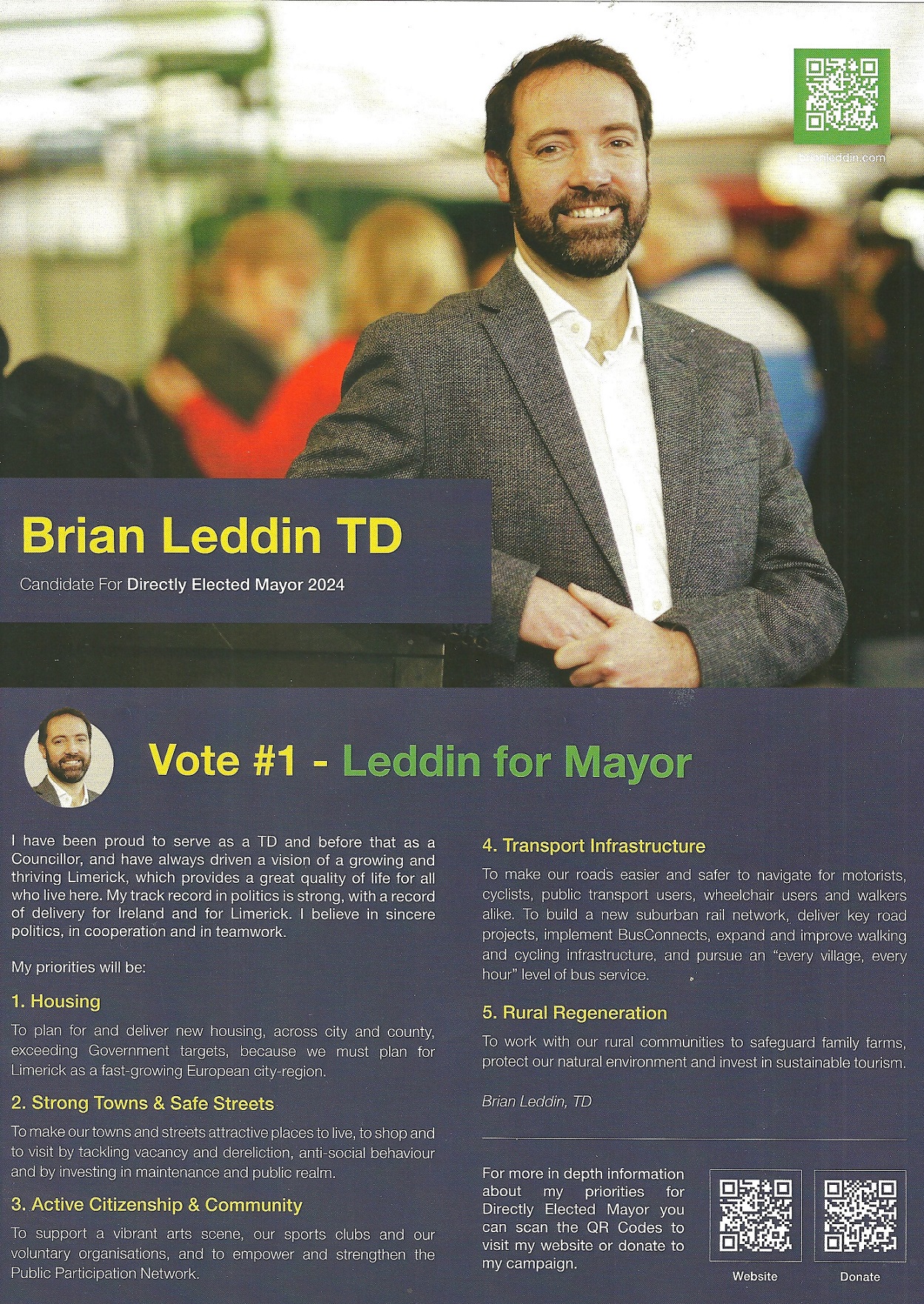 A leaflet from Brian Leddin of The Green Party who is running for The directly elected Mayor of Limerick in the 2024 Local Elections.