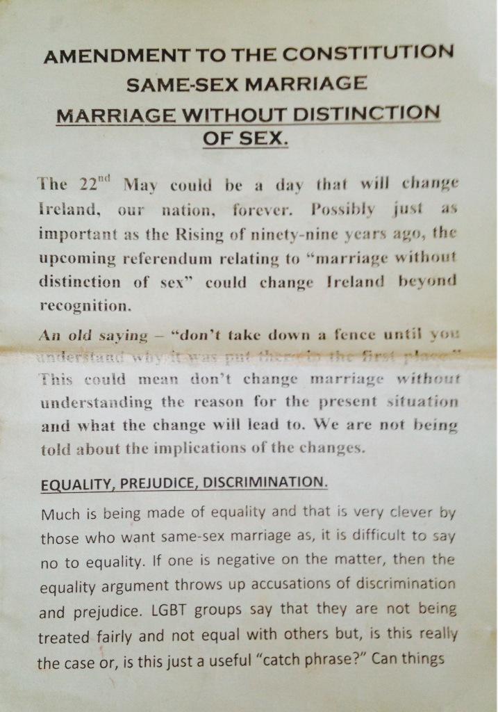 From the Marriage Equality Referendum a leaflet from an unnamed group looking for a No Vote. (apologies for the state of it but I picked it up off the ground)