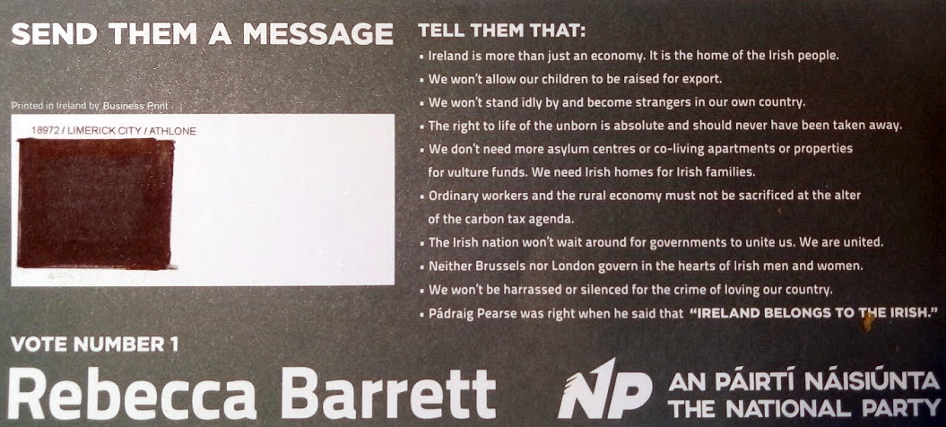 Leaflet from Rebecca Barrett – The National Party -Limerick City #GE2020 February 4, 2020