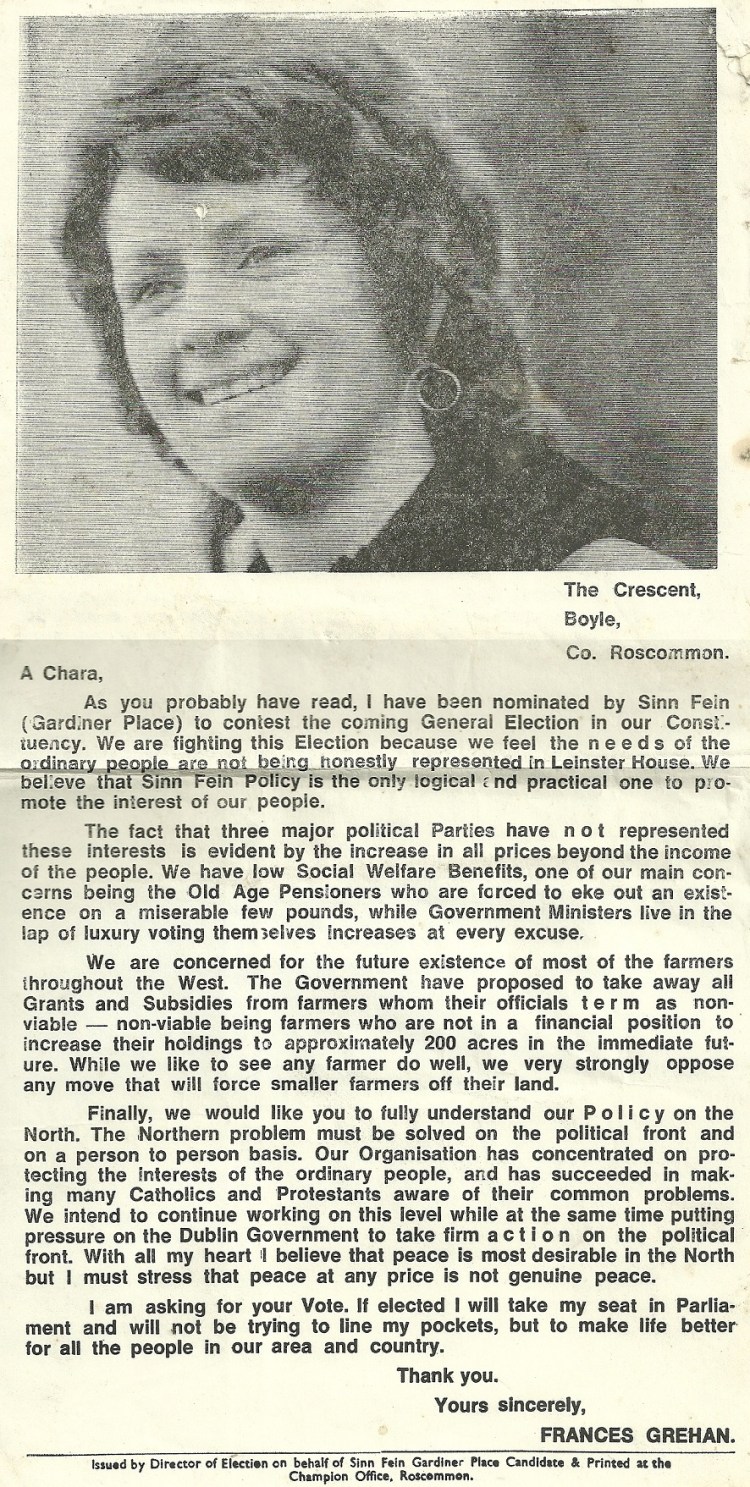 From the 1973 General Election a leaflet from Frances Grehan of Official Sinn Fein running in Roscommon Leitrim. She polled 770 votes and missed out on a seat.