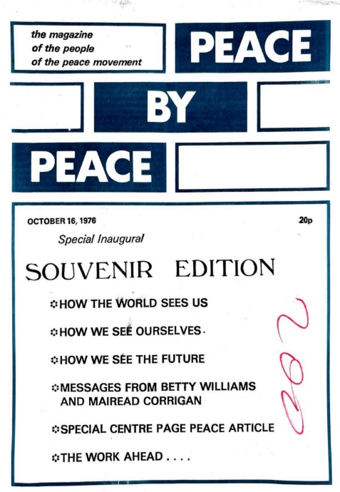 From 1976 , the inaugural edition of “Peace By Peace” the newspaper of The Peace People. The Peace People began in 1976 as a protest movement against the on-going violence in Northern Ireland. Its three founders were: Mairead Corrigan, (now Mairead Corrigan Maguire), Betty Williams and Ciaran McKeown. Over 100,000 people were involved in the initial movement and two of the founders, Mairead and Betty, received the Nobel Peace Prize for that year.
