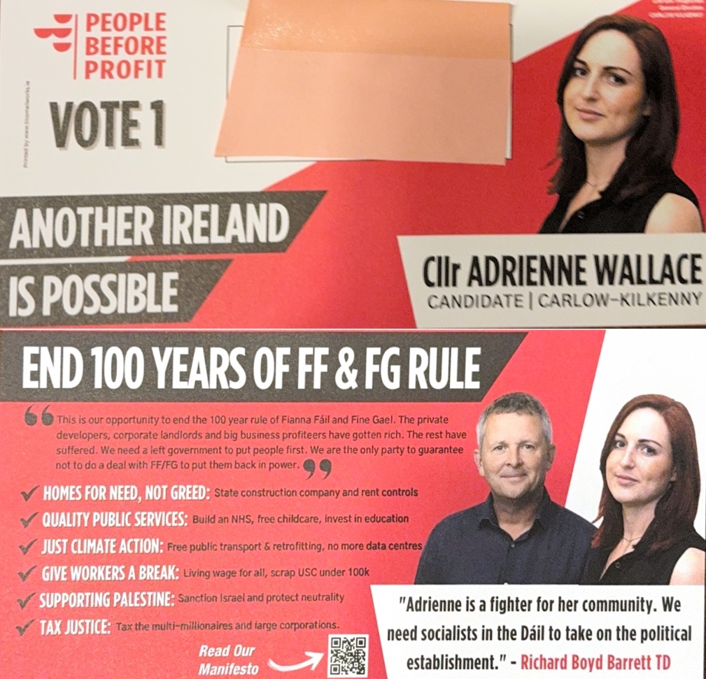 A Leaflet from Adrienne Wallace who is running for People Before Profit in Carlow Kilkenny in the 2024 General Election