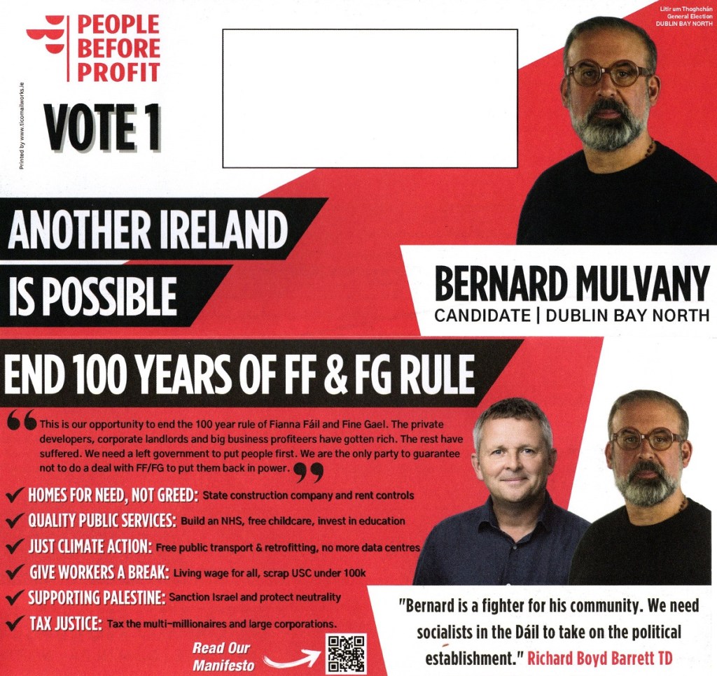 A Leaflet from Bernard Mulvany running for People Before Profit in Dublin Bay North in the 2024 General Election