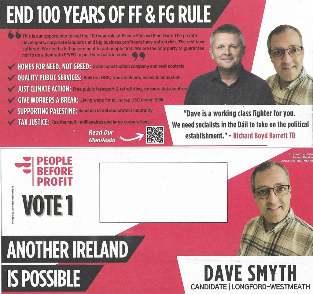 A Leaflet from Dave Smyth who is running for People Before Profit in Longford Westmeath in the 2024 General Election