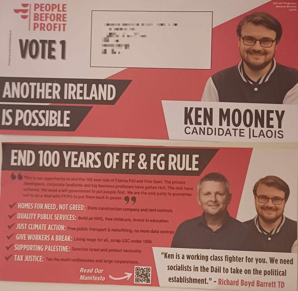 A Leaflet from Ken Mooney who is running for People Before Profit in Laois in the 2024 General Election