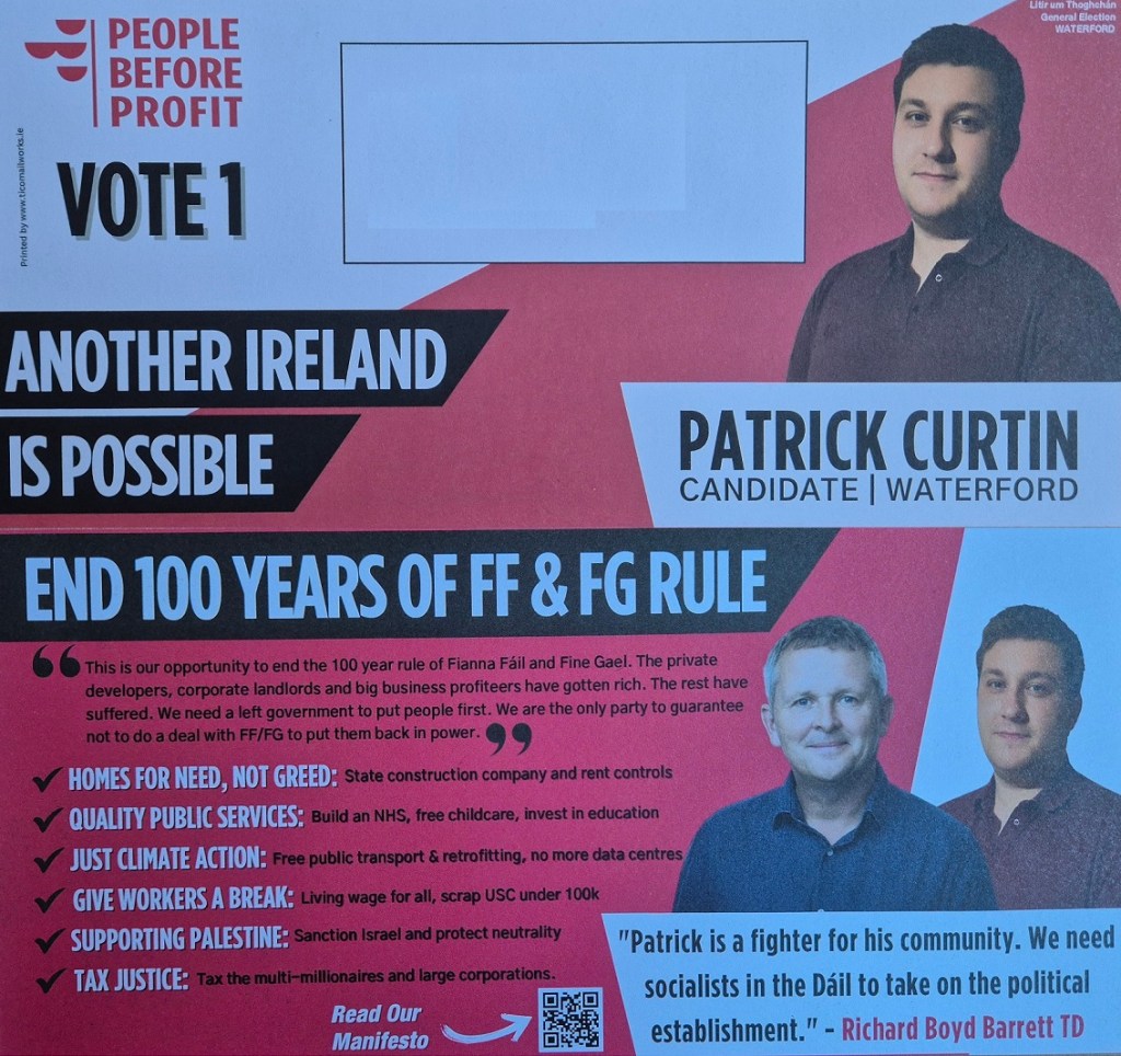 A leaflet from Patrick Curtin who is running for People Before Profit in Waterford in the 2024 General Election