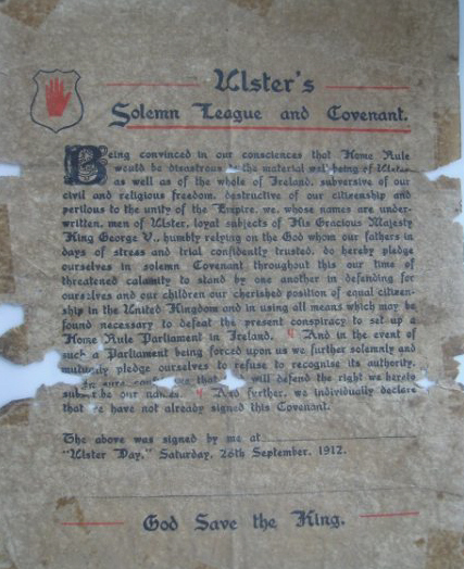 It’s ‘Ulster’s Solemn League and Covenant’ known as ‘The Covenant’ from 1912. Many of the most ardent opponents of Home Rule were said to have signed it in their own blood, not the only blood spilled over that bill.