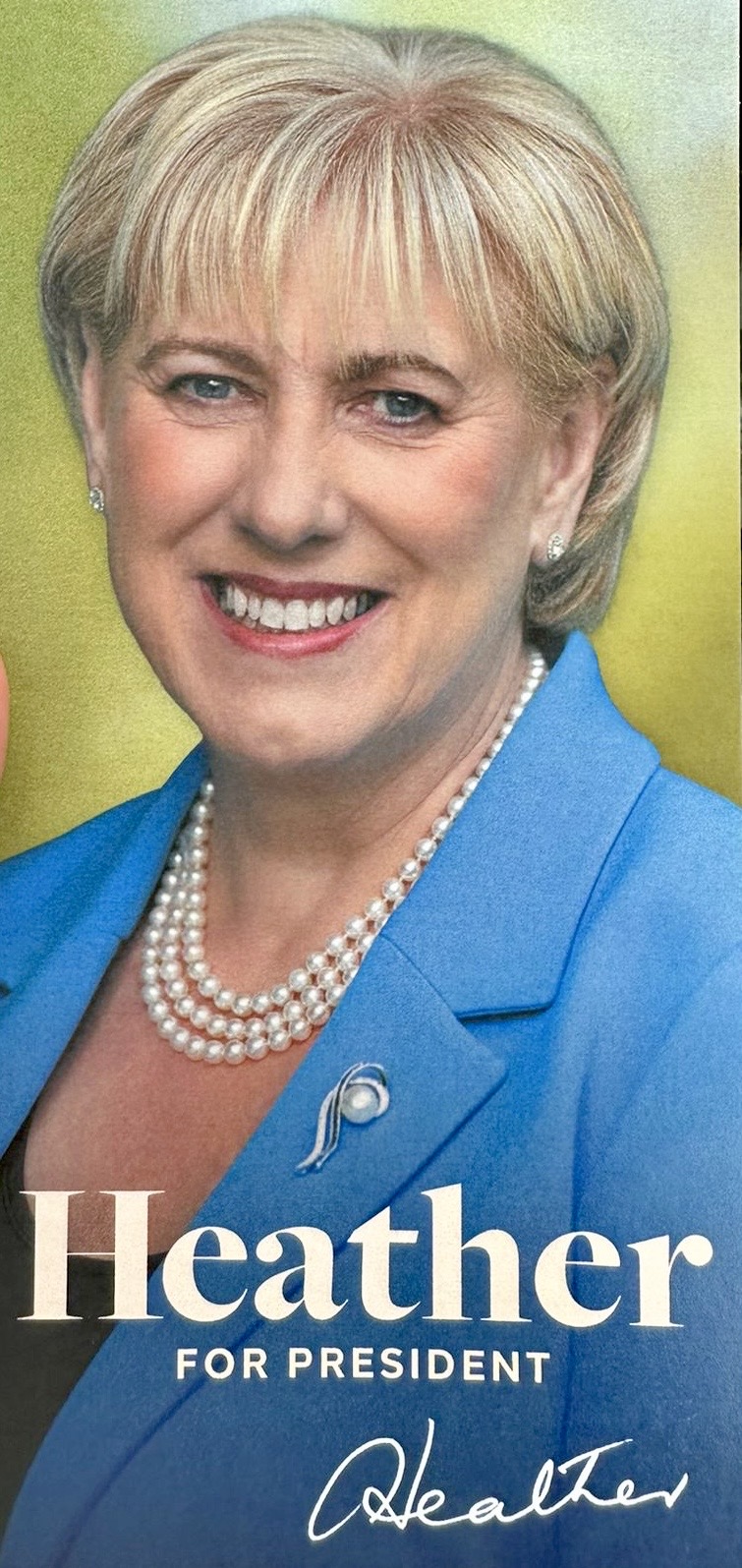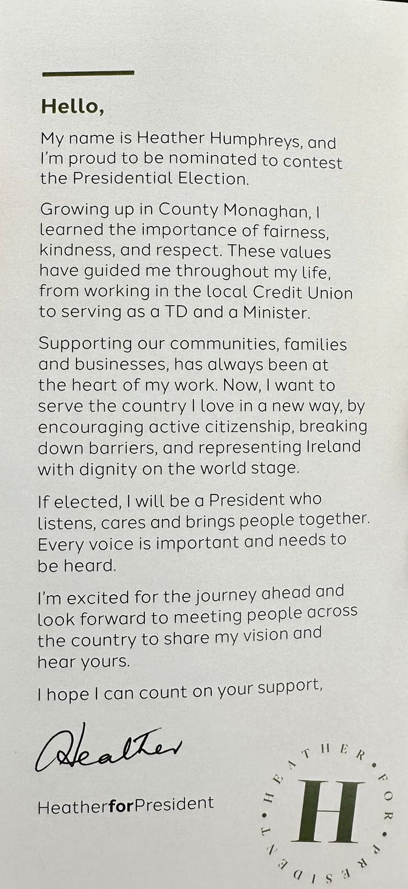A leaflet from Heather Humphreys who is running for Fine Gael in the 2025 Presidential Election.
