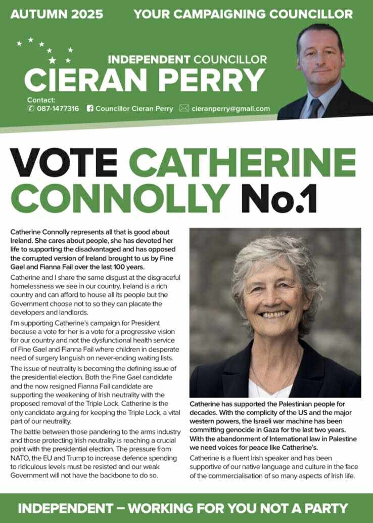 A “Vote Catherine Connolly no. 1” leaflet from Independent Dublin City Councillor , Cieran Perry from the 2025 Presidential Election.