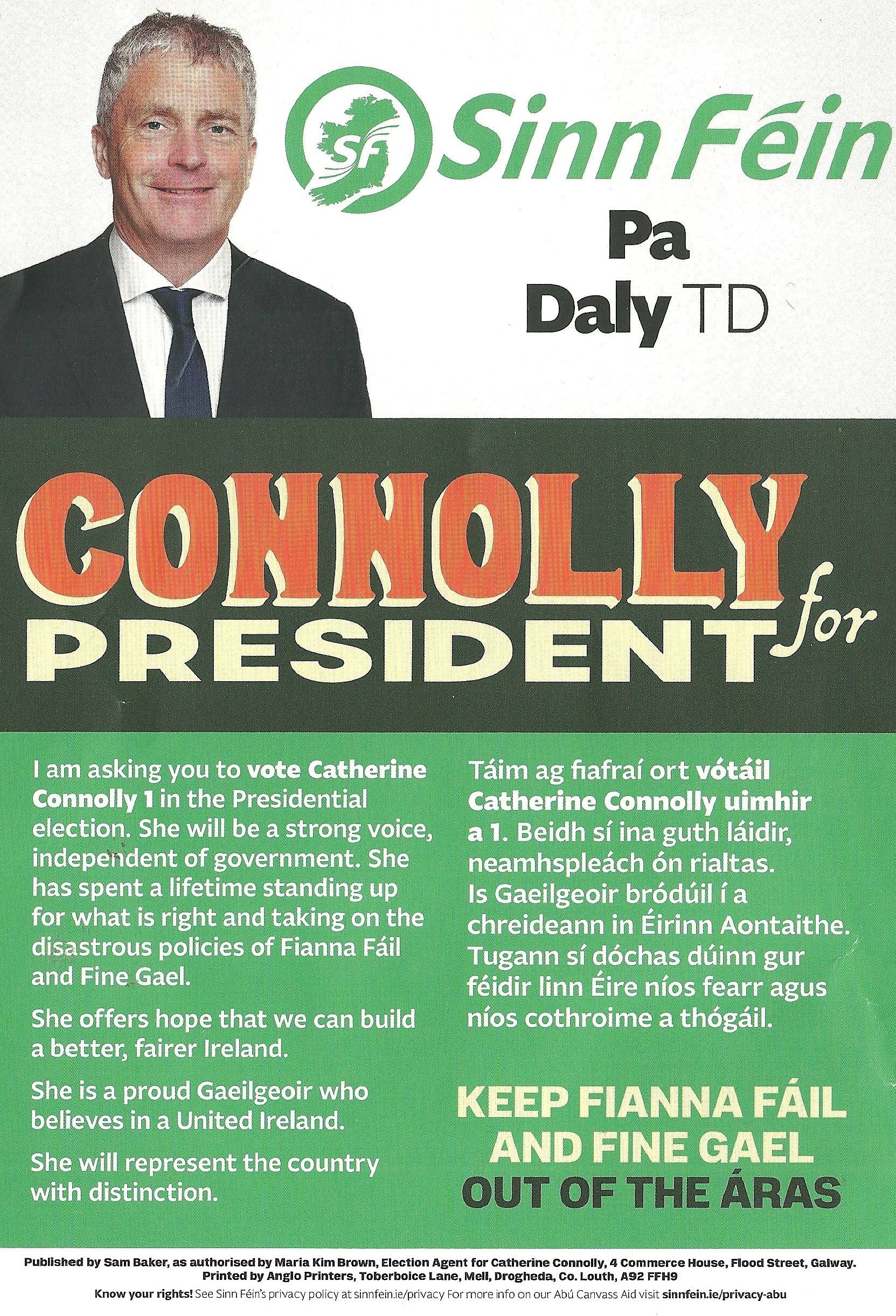 “Connolly for President” a leaflet from Pa Daly the Sinn Féin TD for Kerry from the 2025 Presidential Election.
