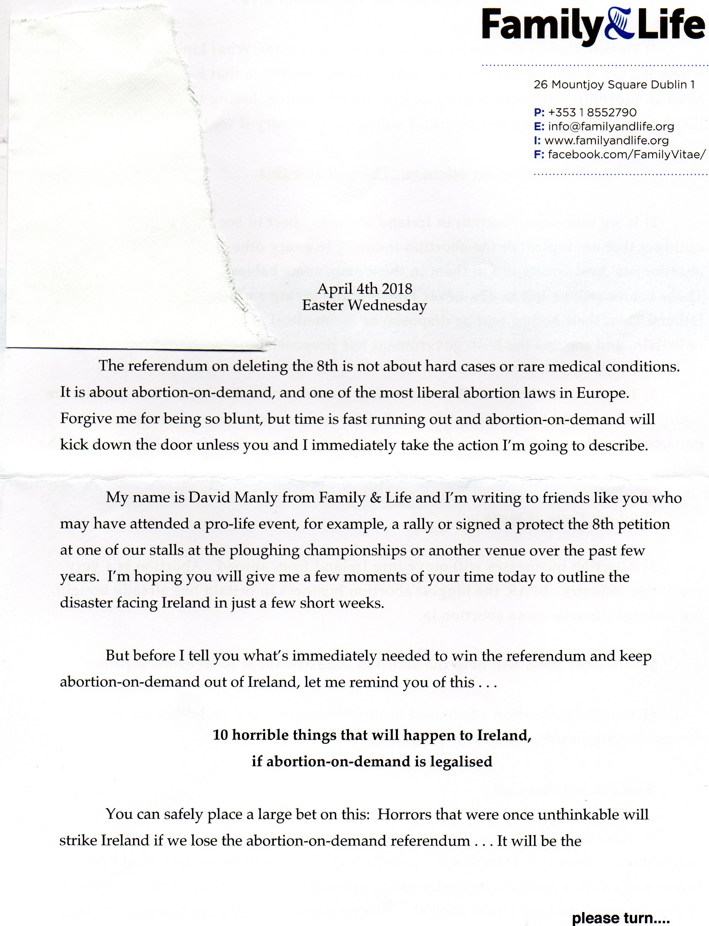 A letter from Family & Life with regard to the 8th Amendment Referendum Campaign outlining what will happen if the Referendum passes. It also has an appeal for funds.